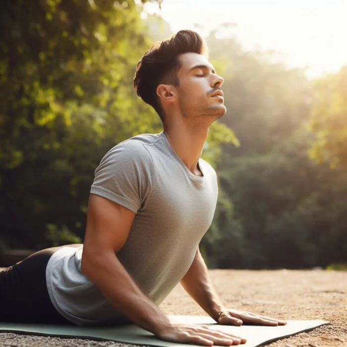 - وضع الكوبرا: هذا الوضع يساعد على تقوية عضلات الظهر وتمددها، وتمدد عضلات الصدر والبطن. استلقِ على بطنك مع يديك تحت كتفيك ومرفقيك قريبين من جسدك. انفخ وارفع صدرك عن الأرض